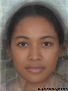 |  Description:Relatively recent Bantuid-South Mongolid contact type native to the island of Madagascar. Formed when Malay immigrants from the Sunda Islands met Bantu from East Africa some millennia ago. Arabid and Indid elements entered as well. The type shares the island with Bantuids, full South Mongolids, and even some Veddoids. Common in Sihanka, Betsileo, Betsimisaraka, Tsimihety, Sakalava, etc. Physical Traits:Medium brown skin and often (tight-)curly hair. Medium height, meso-, sometimes brachyskelic, variable body type. Mesocephalic, mildly hypsicranic. Meso- platyrrhine nose that is not very prominent. Sporadically slanting eyes, prognathy absent, hairiness weak.