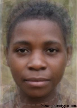 |  Description:Type of the West African Pygmies, that split from East Bambutid during the late Paleolithic. Shows a strong rainforest adaption. Historically more widespread, still found in the forests of Cameroon, Gabon, Congo, and Central African Republic. Typified by the Baka, Aka, Bongo, Gyele, and Kola. Loss of culture and forest destruction could make this unique type vanish forever soon. Physical Traits:Medium to dark, sometimes light (yellowish) brown skin with (reddish) brown-black peppercorn hair. (Very) short, (hyper-) macroskelic, mesomorph, occasionally hairy body. Rarely steatopygic. Meso- brachycephalic, orthocranic, rather small-headed. (Hyper-)platyrrhine. Compared to East Bambutids bodies are taller, faces longer, nasal roots higher, and prognathy stronger.
