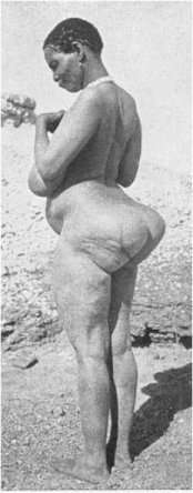 | The most remarkable feature in human fat distribution is steatopygia. In steatopygic individuals there is a marked accumulation of fat over the buttocks, even when the fat layer of the rest of the body is only slight to moderate. In extreme cases the upper surface of the buttocks is so large that an infant can stand on it with arms around the mother's neck. Steatopygia is usually more pronounced in females, but also occurs in males. In periods of rich food supply the fat accumulation quickly increases, while it reduces in periods with poor food supply.